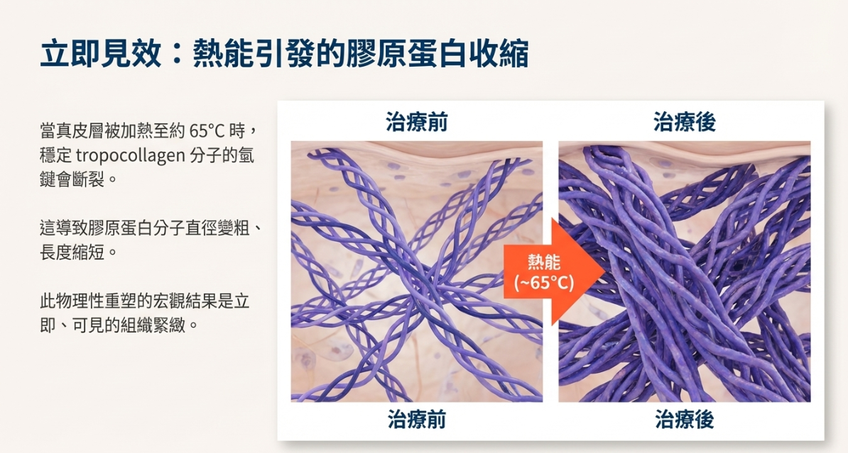 透過約 65°C 的熱能,使既有膠原蛋白瞬間收縮,產生立即的緊實效果。
