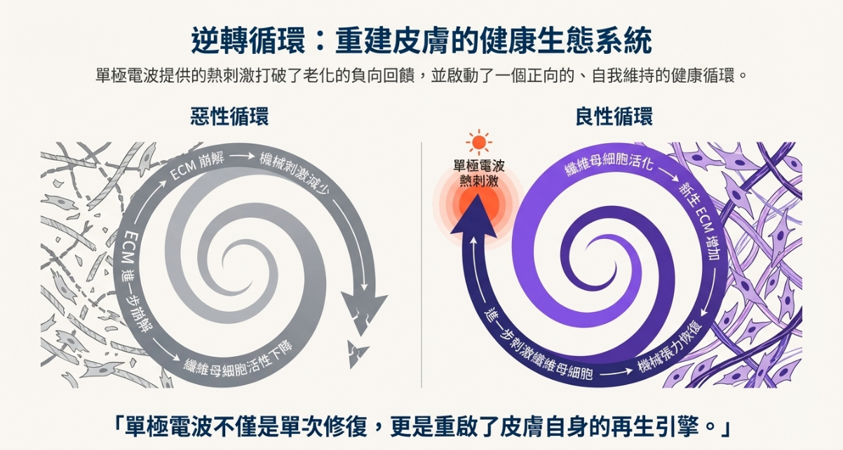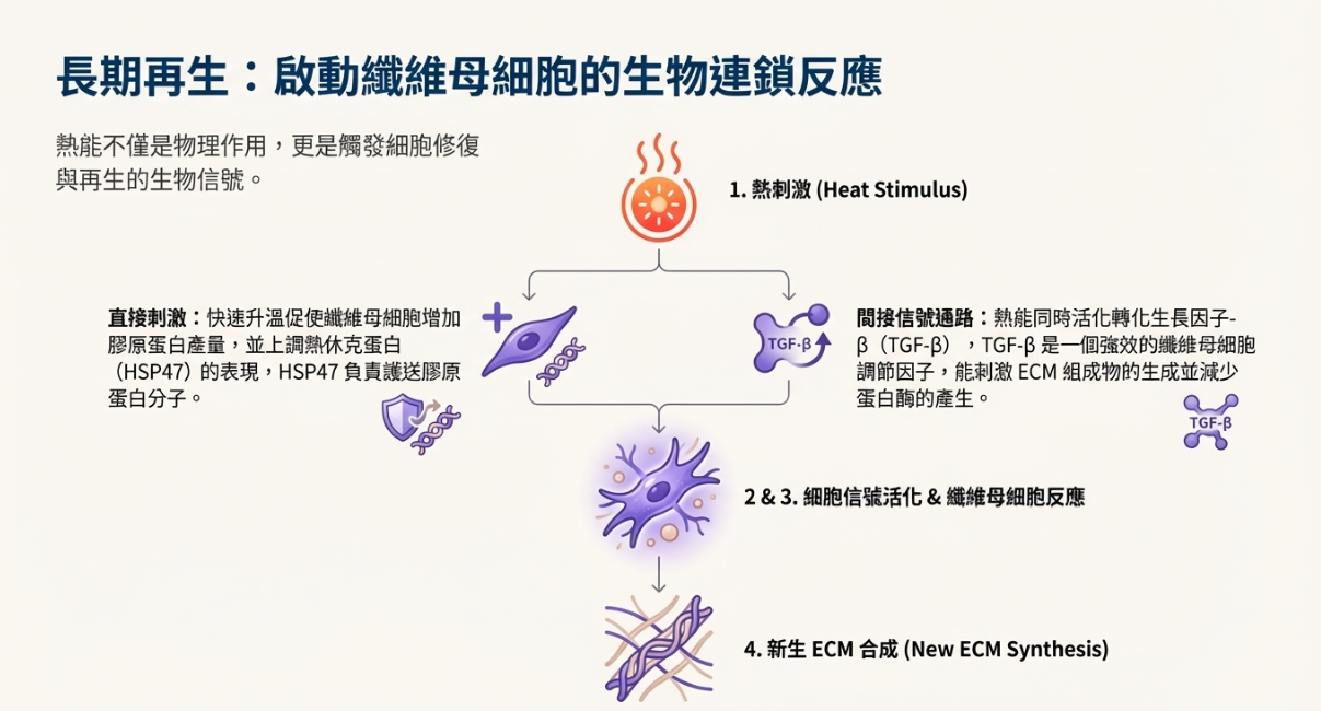 當新的細胞外基質逐步形成,纖維母細胞重新獲得刺激來源,便能持續製造膠原蛋白,形成一個自我維持的健康正循環。