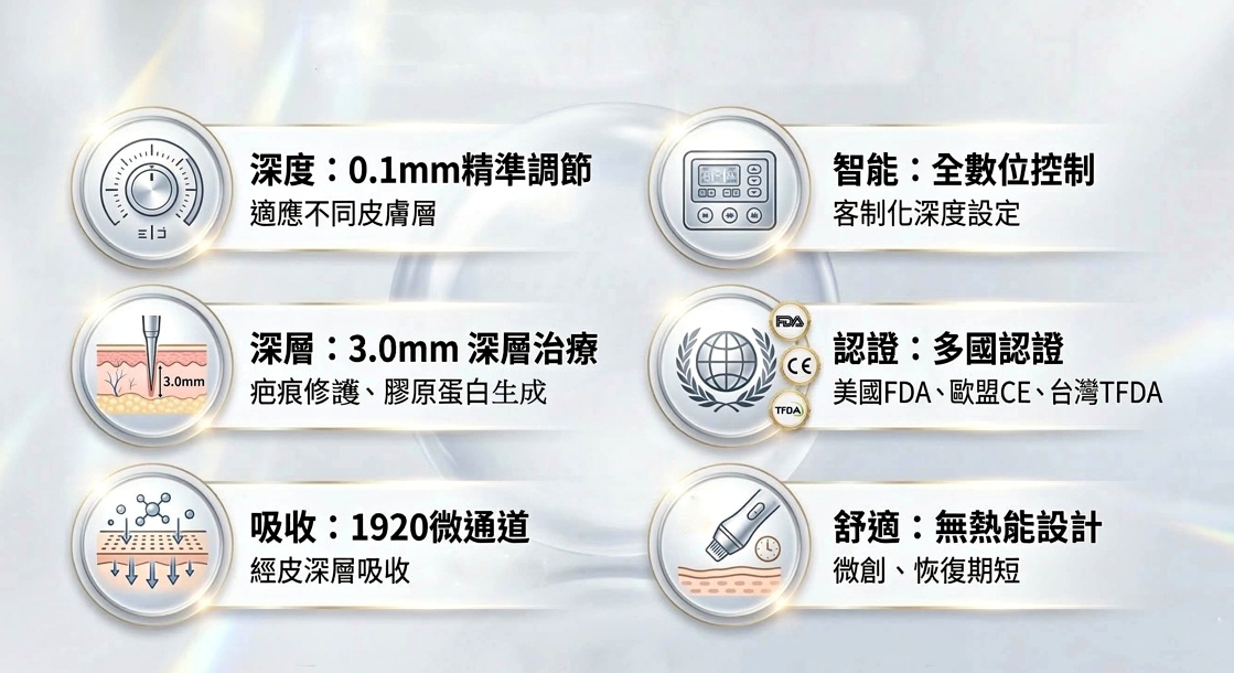 ˙最深可達3.0mm:具有3.0mm最深設定,適合深層治療,如疤痕修護、刺激膠原蛋白生成。