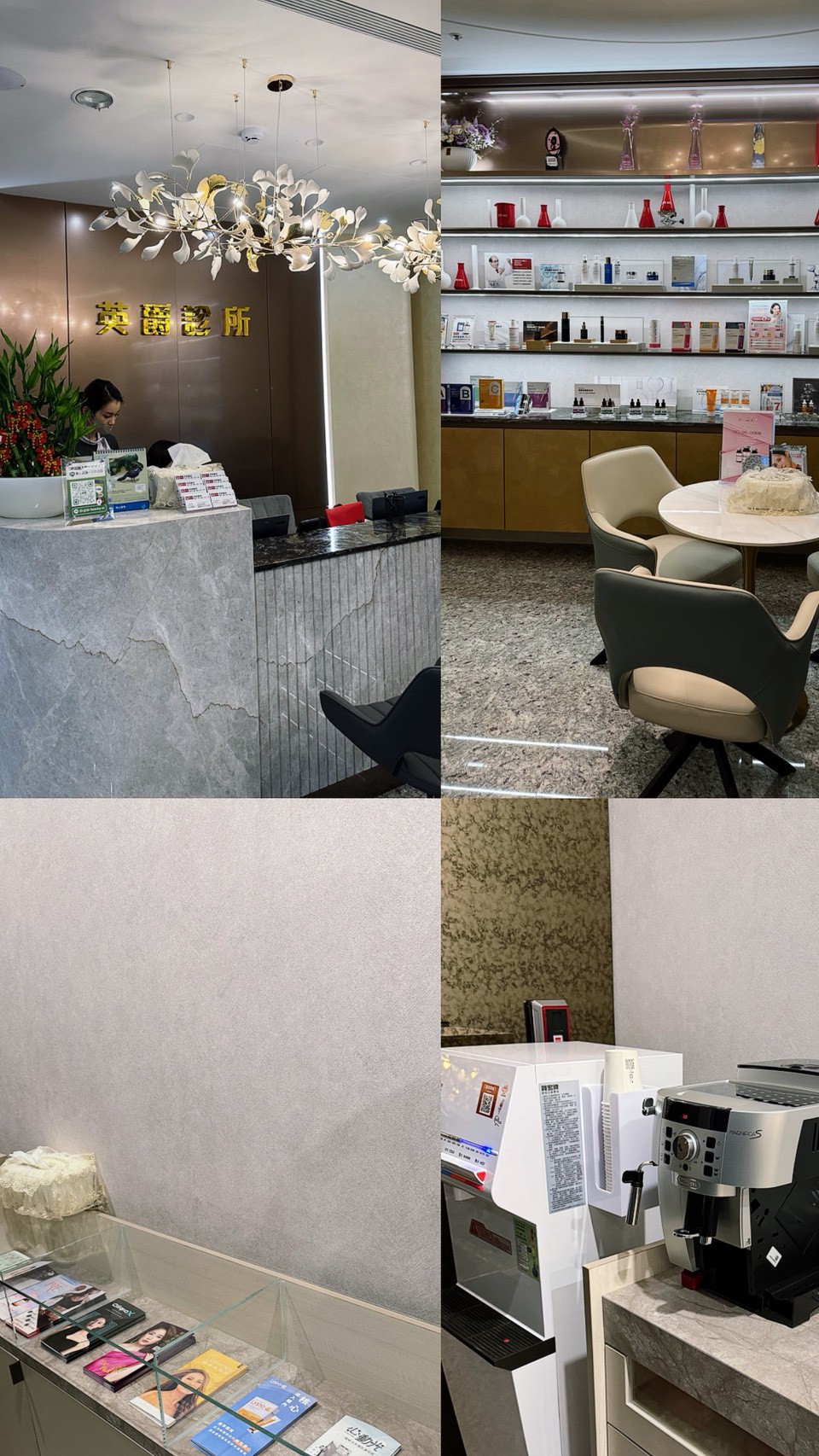 映入眼簾的是寬敞明亮的診所空間,一樓有播放DR.WU吳英俊院長的衛教影片,旁邊也放了各種療程的介紹手冊。更貼心的是,報到之後會直接帶到獨立的諮詢室,完全不用擔心隱私!