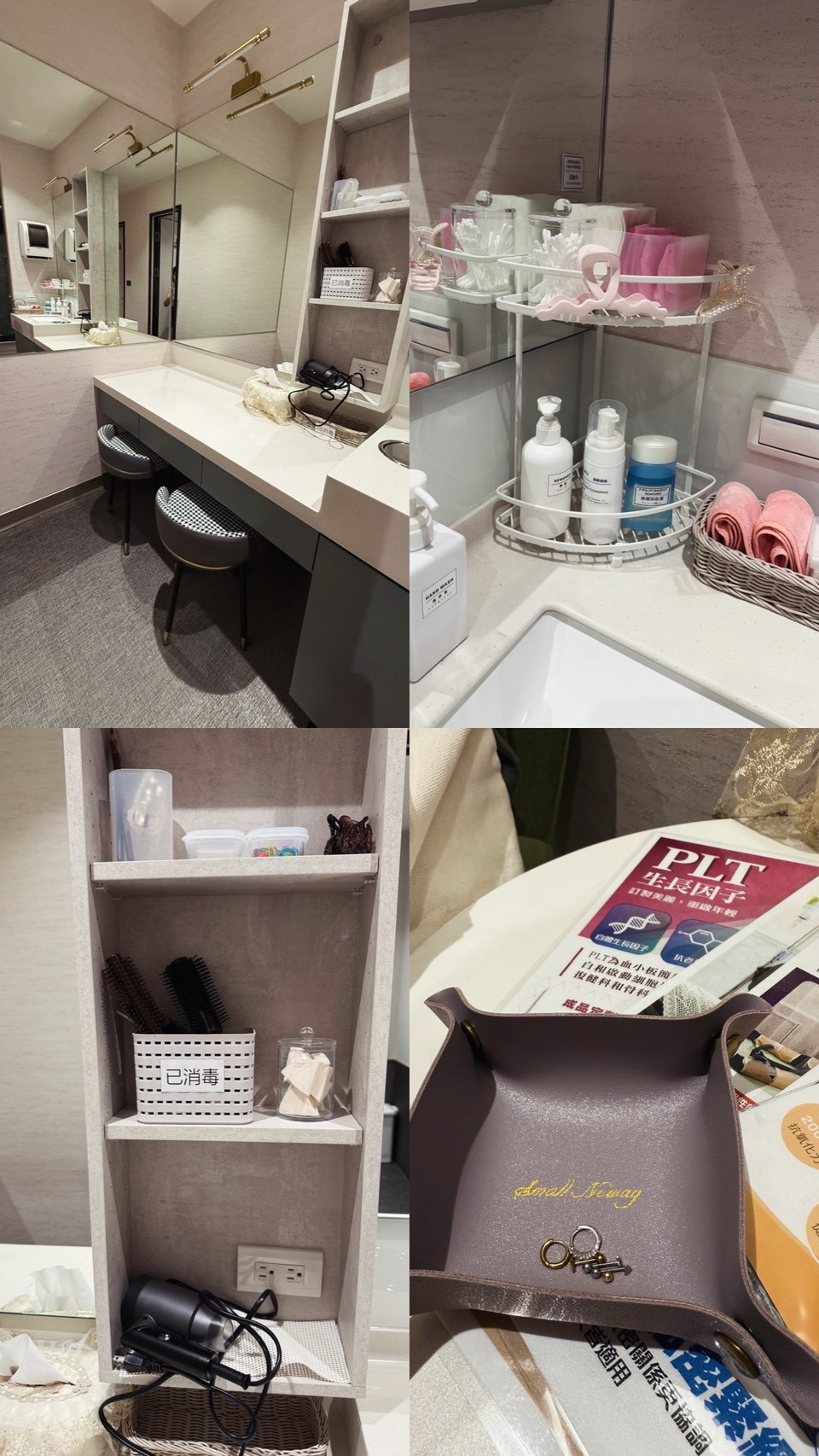 施打後來這個小天地重新整理自己,備品齊全到令人讚嘆,而且所有東西都是一次性,不會和別人共用,最喜歡的小細節是梳妝台隱身在一個L型走廊內,真的隱私與安全感一百分,做完療程來這邊梳妝打扮一下,又可以和朋友再去其他地方約會!